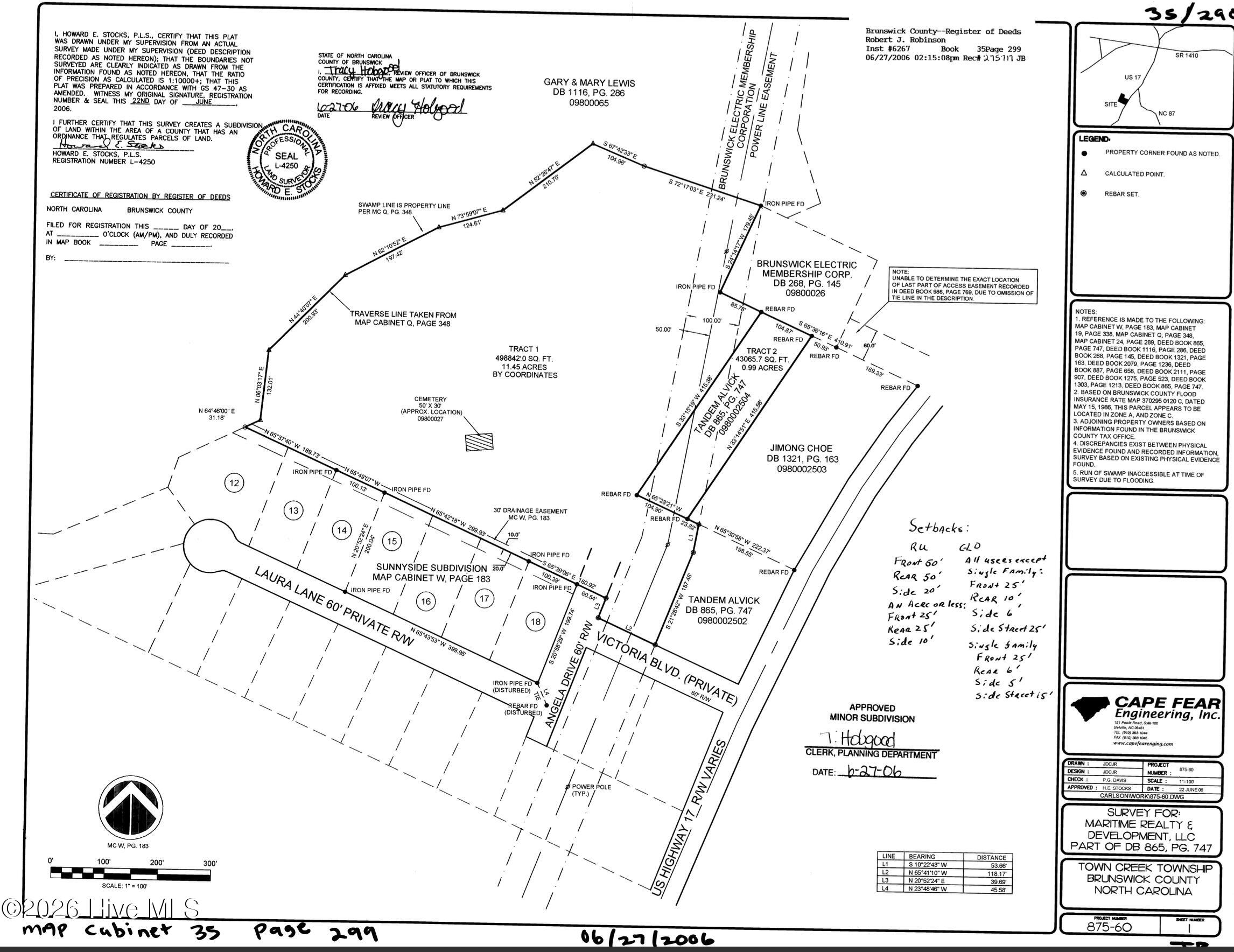 12.4 ACRE OFFERING INCLUDES (7) PARCELS OF UNRESTRICTED LAND IN Winnabow, NC. Ideal for Private Estate or FAMILY COMPOUND-Builders-Investors 12.4 Acres with water frontage along the creek rolling up to a high wooded sand ridge. FLOOD ZONE LIMITED TO CREEK EDGE AREA at the lower portion of property near the water. Located just off NC Ocean Highway 17, and only 5 minutes to Brunswick Forest, and closer to the I-140 Bypass. Offering includes: A formerly approved 5 lot minor subdivision, with a 45' to be constructed right of way, 7.5 acres zoned RR (approved for 8 additional ½ acre ~ 2 acre lots using the same right of way), and a .99-acre parcel zoned CLD! OR Keep as a single family estate or compound. UNRESTRICTED 12.4 ACRES ON CREEK! HIGH SANDY BLUFF WELL OUTSIDE FLOOD PLAIN! Recent survey, soils mapping, wetland delineation, and flood reports completed. This is a multiple parcel offering, which includes an approved 5 lot minor subdivision (not developed), ~9 acres Zoned RR, and .99 acres Zoned CLD. See attached surveys, and additional information provided. Listing agent has contractual interest in the property. Horses, barndorminium, four wheelers, trails, fishing! All within 10 minutes to major retailers, restaurants, golf, and Historic Downtown Wilmington another 5 minutes over the bridge! Finding unrestricted acreage this close to Wilmington, NC is rare. All the hard work is done. BEMC easement released 3-2026.